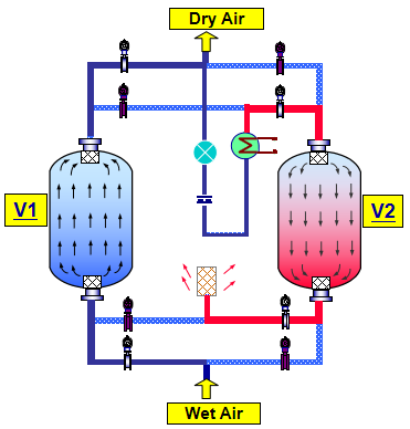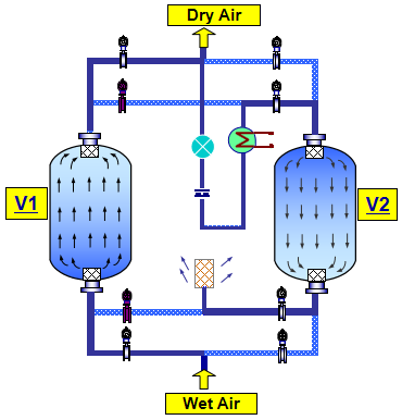 微热再生吸附式干燥机由下列部件组成:两台替换作业的干燥塔、一台电(或蒸汽)加热器(选配)、一套冷却器(零耗气需求)、一套切换阀门、一套外表及操控办理体系(节能露点操控体系可选)。
